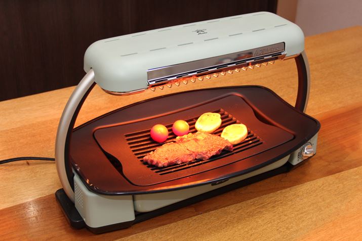 そして、熱源となる「遠赤グラファイト」もポイント! 遠赤グラファイトはカーボンヒーターの一種ですが、スイッチを入れるとわずか0.2秒で発熱し、すばやく食材に熱を伝えます。しかも、その熱は遠赤外線の熱線によって食材を直接熱する「輻射熱」。輻射熱を利用した身近な調理方法には「炭火焼き」がありますが、グラファイトグリラーで焼いた食材も炭火で焼いたような仕上がりが望めるといいます。