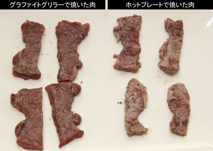 焼き上がった肉を食べ比べてみると、どちらもおいしかったです(笑)。しかし、じっくりと比べながら食べてみると、グラファイトグリラーで焼いた肉のほうがふっくらした食感。対するホットプレートで焼いた肉は、焦げ目がしっかりとついているので香ばしさが口に広がるものの、肉自体の味が薄いというか、少し水っぽい感じです。焼き上がりの肉を置いておいた皿にも、ホットプレートで焼いたほうの肉は水分が染み出していました。
