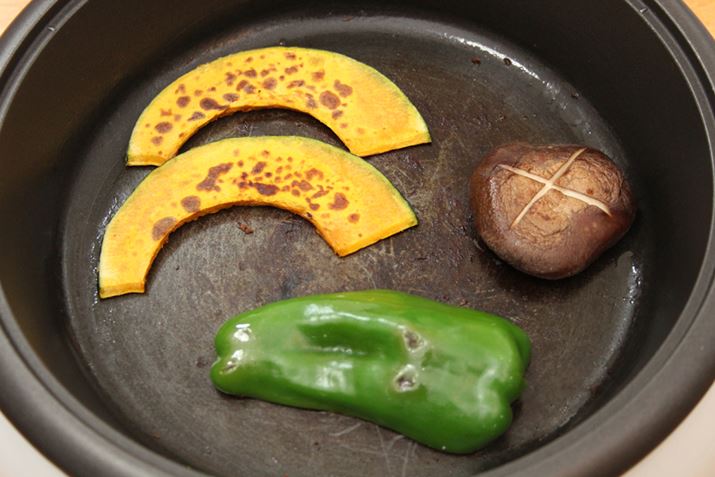 いっぽう、グラファイトグリラーでの加熱はというと……カボチャがまるで焼きイモのようにほくほくに! シイタケとピーマンには十分に火が通り、みずからの水分で蒸し焼きされたような仕上がりになっていました