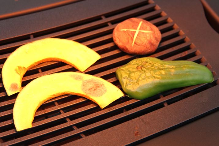 ホットプレートで焼いたカボチャは香ばしさとやわらかさがいい感じでしたが、シイタケはもう少し中を加熱したい印象。ピーマンは生に近く、パリパリです。とはいえ、どちらも焦げ色がつき始めているので、加熱しすぎると炭化して苦くなりそう