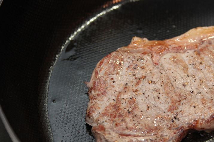 焼肉対決では、あまりグラファイトグリラーの魅力を感じられなかったので(おいしかったですが)、今度は厚みのある肉……ステーキを焼いてみます。対戦相手は、フライパン! しかも、肉がおいしく焼けるという鉄製。ハードルをグッと上げて、グラファイトグリラーに挑みます。