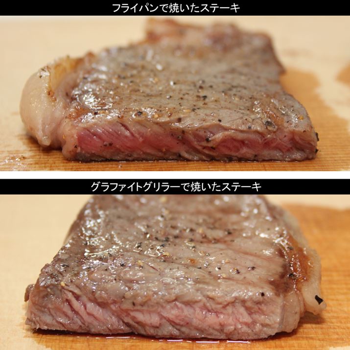 フライパンは肉の表面からジワジワと熱が伝わっていくため、表面がしっかり焼けていても火の通りは甘くなることも。逆に、レアな焼きは得意です。いっぽう、グラファイトグリラーは肉の中まで火が通って、ミディアムな仕上がり
