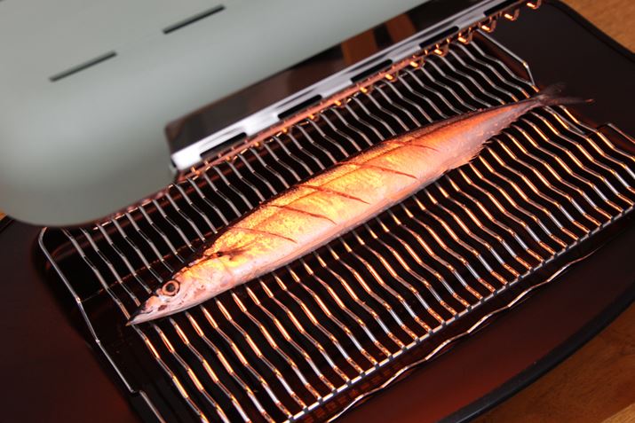 サンマを置いて約1分、表面の脂がジウジウと小さな音を立てはじめ、同時に魚の焼けるニオイもしてきます。しかし、煙は出ていません。そして8分ほど経過すると、皮がパリッといい感じに焼けてきたので裏返し、7分ほど裏面も焼き、完成です