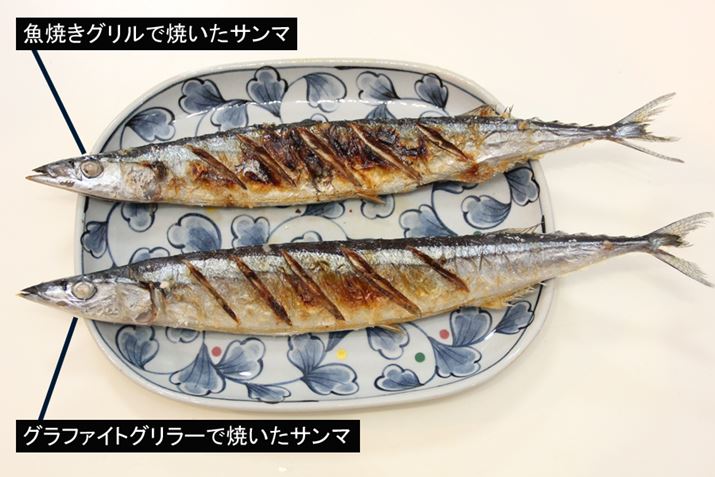 魚焼きグリルは直火が当たるため、少々焦げが多い印象。グラファイトグリラーで焼いたサンマには炭化している部分が少なく、焦げ色が上品な感じがします