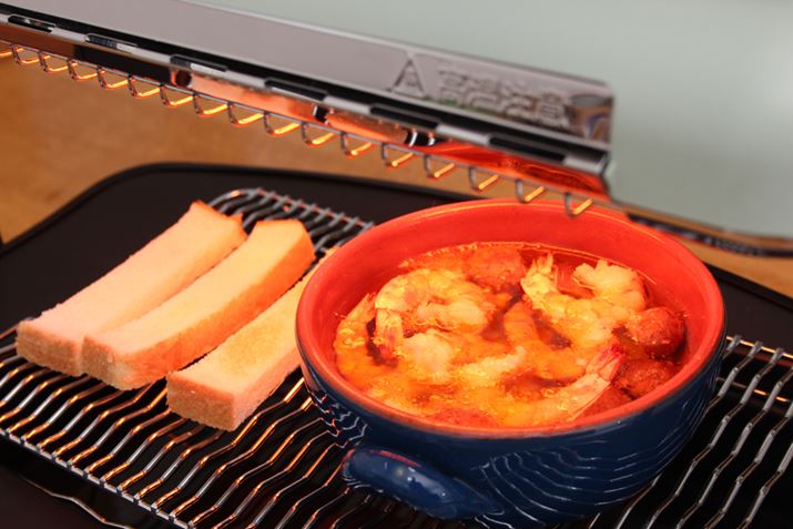 細長く切った食パンを並べ、トーストをアヒージョにつけながら食べようと思ったのですが、上からのヒーターが熱くて手や箸でアヒージョにつけるのはムリでした。チーズフォンデュで使うような長いフォークを用意すれば、熱々を楽しめます