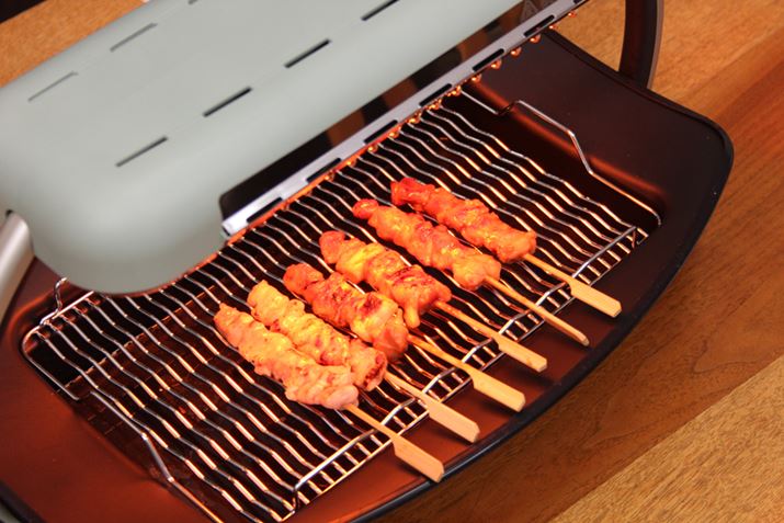 次は、グラファイトグリラーの構造的に合いそうな料理をチョイス。串にさした焼き鳥を焼いてみましょう。魚を焼く時に利用するヘルシーネットは裏返すと、高さが変わり、熱源からの距離が若干遠くなります。さらに、サイドに凸凹とした形状が現れるので、そこに串を載せれば、串を持って焼き鳥をクルクルと裏返すのもやりやすい!
