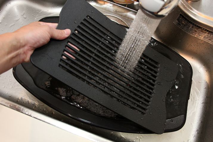 後片付けはとても簡単です。水の入ったトレイを外し、クイックプレートやヘルシーネットと一緒に洗うだけ。クイックプレートはフッ素加工が施してあるので、汚れは簡単に落とせます。ヘルシーネットはステンレスワイヤーが太くしっかりしているため、スポンジでゴシゴシ洗ってもたわみませんでした。