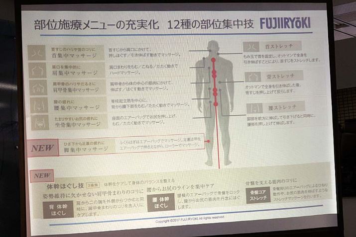 「部位集中技」の詳細。「AS-1100」では、「部位集中マッサージ」に脚部が加わったほか、「体幹ほぐし技」が追加された