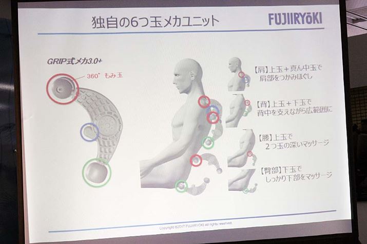 「GRIP式メカ3.0+(プラス)」では、肩は上玉と中玉でつかんでほぐし、背中は上玉と下玉で広範囲にマッサージ、腰は上玉が突出することで深く刺激、おしりは下玉の突出によって押し上げるようにほぐす