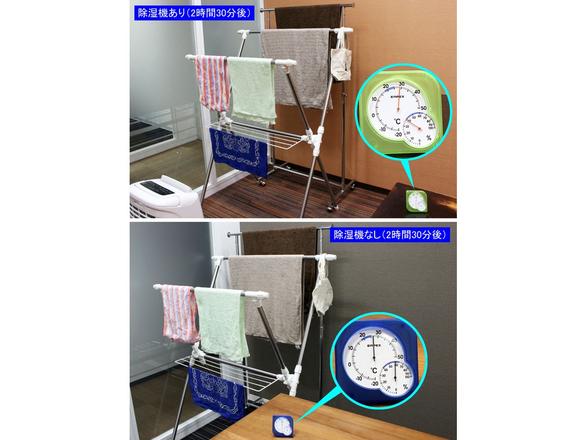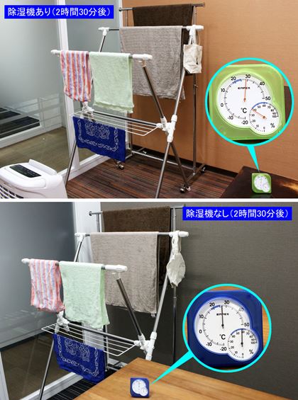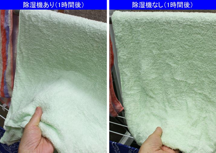 洗濯物を干して1時間後、DCE-120のある部屋のタオルが完全に乾きました。除湿機のない部屋のタオルは、干した時のままというほど濡れています。薄い生地のハンカチも、まったく乾いていません
