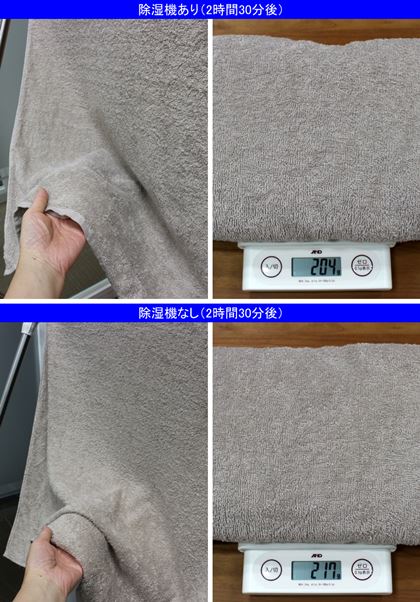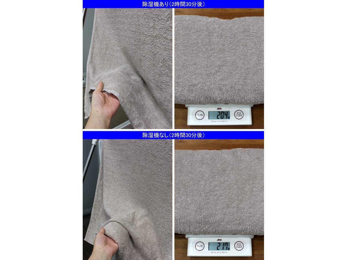 干して2時間30分後のバスタオルの重さを比べてみたところ、13gも重さが違いました。除湿機のない部屋のバスタオルには、13gも水分が含まれているということです