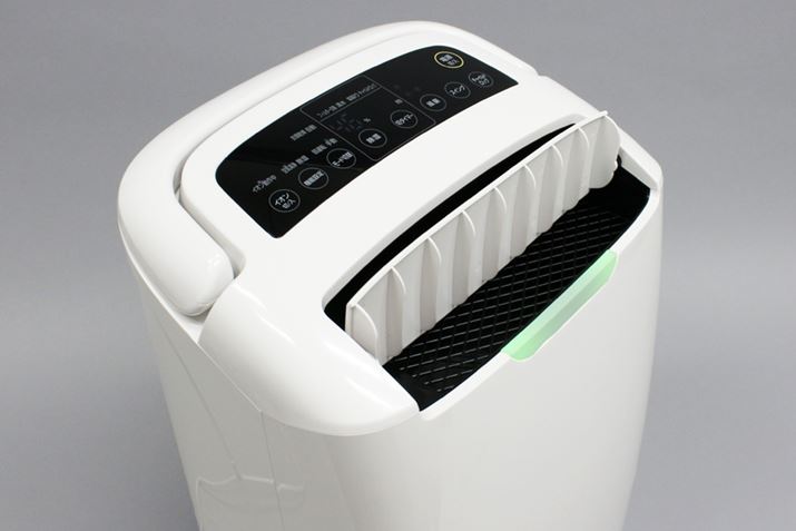 除湿運転の場合、フィルターを通過した空気はコンプレッサー式除湿機で除湿され、キレイな空気となって上部の吹出口から放出。なお、吹出口前方に装備されたランプは5段階の発色で空気の汚れを教えてくれるものです