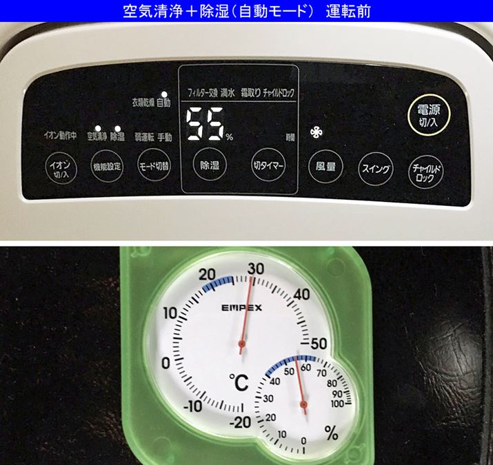 除湿運転は空気清浄も同時に行われるため、「除湿」と「空気清浄」の両方が稼動中のランプが点きます。湿度計とDCE-120に表示された室内の湿度はどちらも55%となっており、DCE-120に搭載されている湿度センサーはなかなか精度も高そう