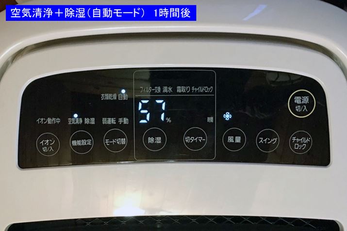 このような現象が起こったのは、自動モードを選んでいたからでした。自動モードは室内の湿度が60%以下になると風量が「1」になり、除湿は停止するのだそう。もともとの湿度が55%だったため、除湿が行われなかったのです。