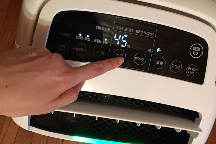 いよいよ、友人宅での検証です。木造一軒家の13畳の部屋にDCE-120を設置し、除湿運転スタート! センサーで空気の汚れと湿度を検知して自動で風量を調節する「自動モード」、設定した目標湿度と風量で運転する「手動モード」、常に風量1で稼動する「弱運転モード」が選べますが、今回は自動モードで稼動させてみました。