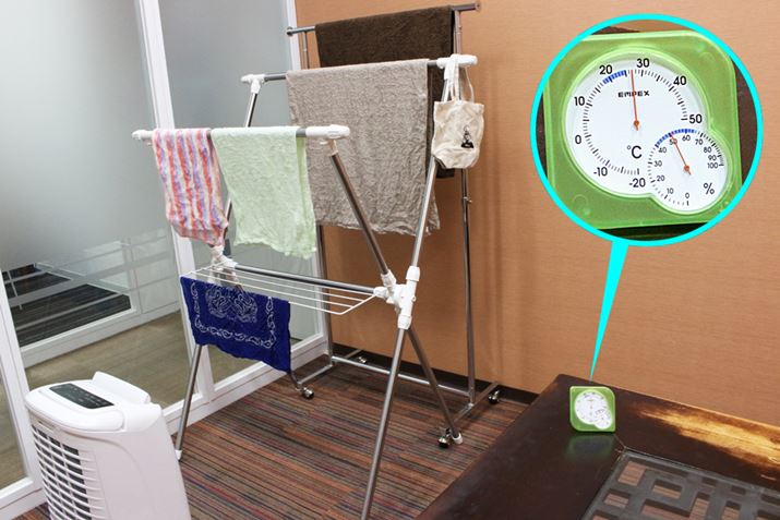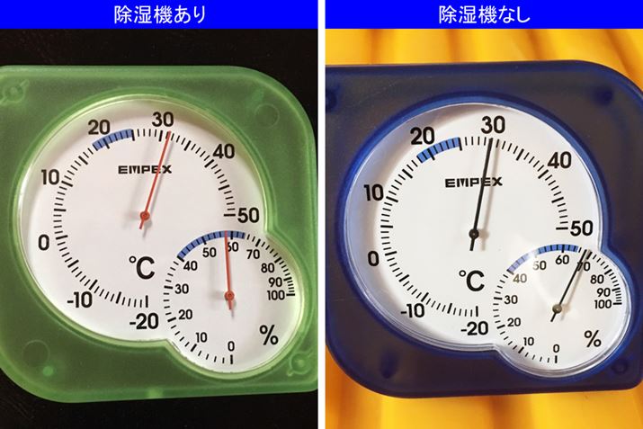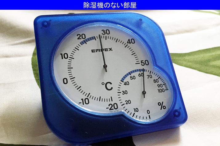 タオルをチェックするのと同時に、湿度計も確認。DCE-120が稼動中の部屋の温度は1℃高くなりましたが、湿度は4%ダウン。除湿機がない部屋は若干室温が下がったものの、湿度が9%も上昇していました