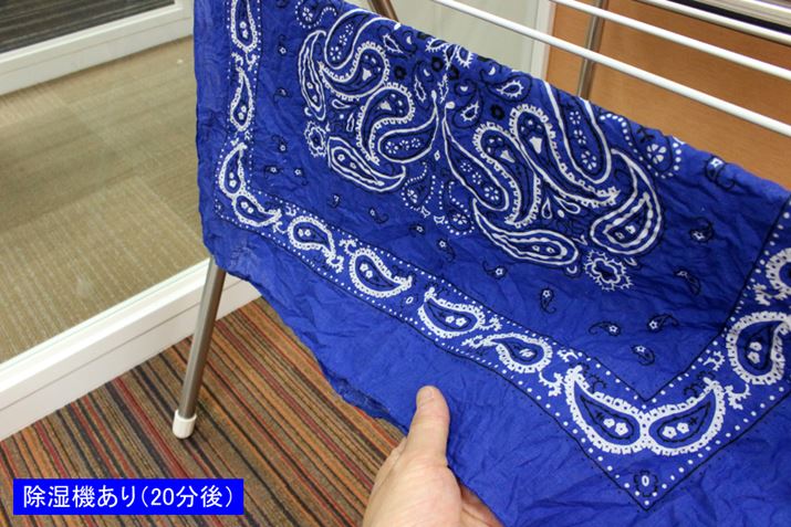 DCE-120の稼動している部屋に干したハンカチは、20分後にはカラカラに! 下のほうに干したので送風は当たっていないにもかかわらず、あっという間に乾いてしまいました