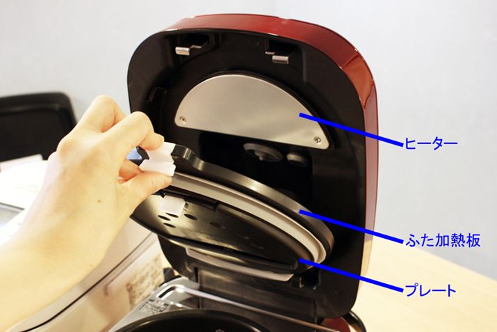 ふっくら御膳は内ブタ部分に装備された「プレート」と「ふた加熱板」の間に炊飯時の蒸気を溜め、その蒸気を蒸らし時にヒーターで加熱し、スチームにして放出します