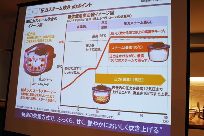 また、蒸気がほとんど出ない蒸気カットの機構も、炊飯時に温度を下げないことにひと役買っているとのこと