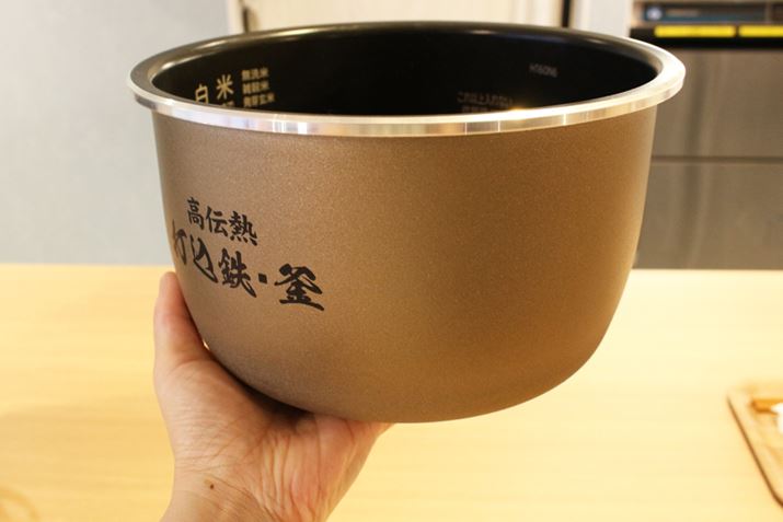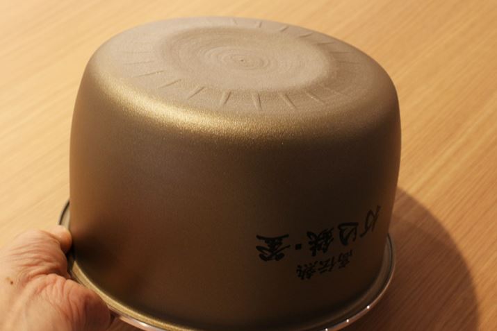 ふっくら御膳の大きな特徴は、内釜にもあります。近年、内釜は蓄熱性を高めるために厚みを増していますが、それに比例し、内釜の重量も増加。米を研いで水を入れて運ぶ際の重さがつらいという声も多いといいます。ふっくら御前は使いやすさにこだわり、アルミ合金製の約720gという軽量な内釜を採用。内釜ではなく、内釜を包み込む本体に蓄熱性を持たせることで“軽量の内釜でもおいしく炊ける”を実現しました。なお、内釜には蓄熱性だけでなく発熱性も求められますが、ふっくら御前の内釜は底面に打ち込まれた鉄層でカバーされているのがポイント。この鉄がIHコイルに反応して発熱し、釜底全体で引き出した1,330Wの大火力を伝熱性の高いアルミ合金が内釜全体にすばやく伝えます。2017年モデルは釜底に打ち付ける鉄粒子の厚みを個所で変え、立ち上がり時の内釜底面の温度ムラを低減。これにより、炊き上がったごはんの硬さの差が大幅になくなったそうです。