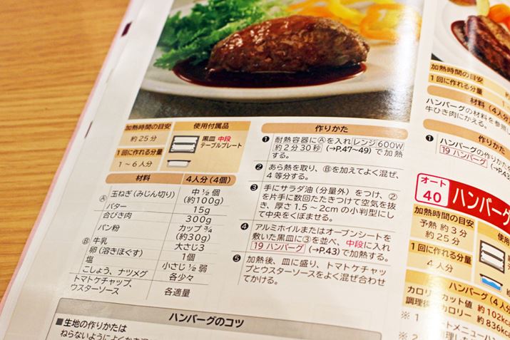 付属のレシピには食材の分量が記載されていますが、「1回に作れる分量」の部分に注目してください。ハンバーグの場合、「1〜6人分」となっています。つまり、ハンバーグの自動調理メニューでは1〜6人分という規定内の分量であれば、「○人分」を指定しなくてOK。重さから最適な加熱を導き出し、調理してくれます