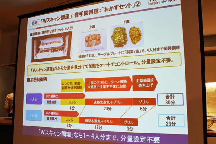 そんなWスキャン調理に「おかずセット」が追加されました。主菜1品、副菜2品を一度に作ることができる料理で、最大4人分まで調理可能。分量を計測して加熱をコントロールするため、分量設定は不要です。