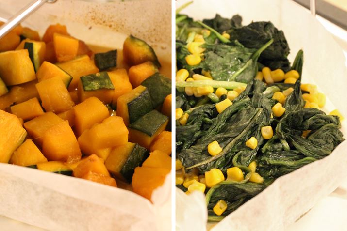 硬いかぼちゃも、葉物のほうれん草も同じ加熱時間でしたら、どちらも悪くない仕上がりです。おかずセットを利用すれば、バランスのよい食事ができそうですね