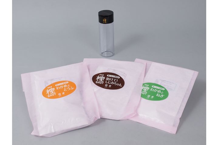 別売りの具。右から「ねぎとわかめ」「助けて! しじみちゃん(しじみとねぎ)」「とうふとわかめ」を使用させてもらった。うしろに置いた「具ッドケース」(別売り)に入れておくと、カップに投入しやすい(写真は2014年2月に流通していたもの)