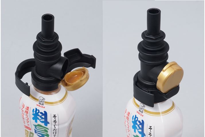 液みそボトルの中栓を外したら、液みそポンプ側面の○枠に、ボトルのふたを合わせてセットし、固定用アームを両側から順にはめ、がっちりとかみ合っていることを確認する(写真で使用している液みそのボトルは旧タイプのもの。リニューアル後のボトルを使用する場合は、キャップを外してから、液みそポンプを取り付ける)