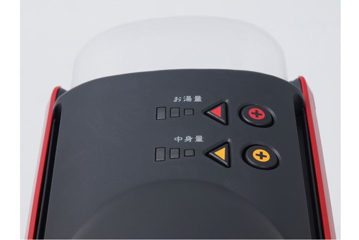 三角のボタンがお湯や液みその量を調節するボタン。ボタン左側の量表示ランプが、設定量に応じて点灯する(左側ほど量が多い)。右側の+マークのボタンを長押しすると、お湯は約25ml、液みそは約2g追加可能