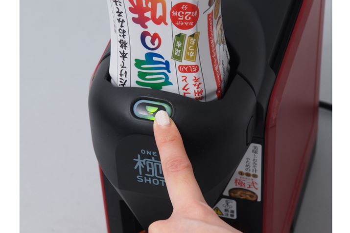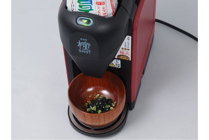 セットが完了したら、あとは電源を入れてボタンを押す。調理可能の状態から、およそ1分でおいしいみそ汁が完成!