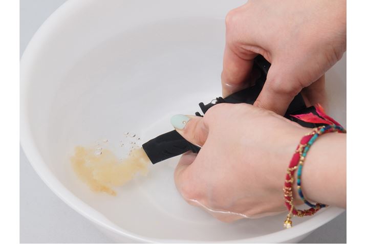 お手入れ時は、アタッチメントを30〜40℃くらいのお湯に入れ、ポンピング動作を行って内部の洗浄をする。かたまりが詰まって液みその出が悪い場合も、この方法で改善することがある