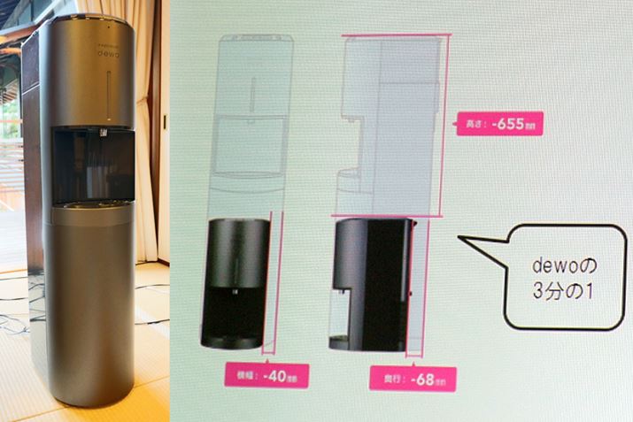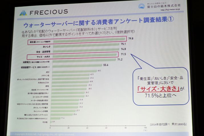 富士山の銘水が行った「ウォーターサーバー選びで重視する点は?」という調査で、「衛生面」と「サイズ」が上位にあがったことから、コンパクトで衛生的な「FRECIOUS dewo mini」を開発したという