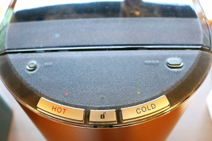 給水レバーはなく、ボタン式を採用。チャイルドロック機能も付いているので、子どものいる家庭でも安心だ。ボタンまわりのLEDは、暗闇でも明るすぎないように設計されている。奥は「エコボタン」と「ニードルボタン」