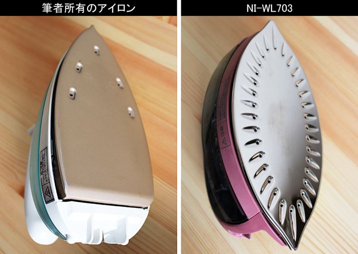 三角形のかけ面をした筆者所有のアイロンには、スチームが出る穴が5つしかありません。いっぽう、NI-WL703は上下左右に動かすことができるので、スチーム穴が全方向に配置されています