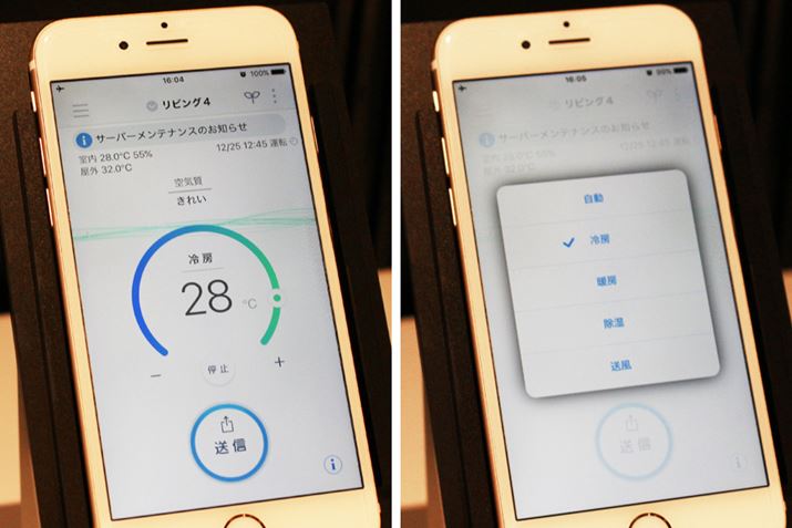 運転をオン/オフするのはもちろん、運転モードの切り替え、温度設定の変更など、さまざまなことがスマートフォンで行えます