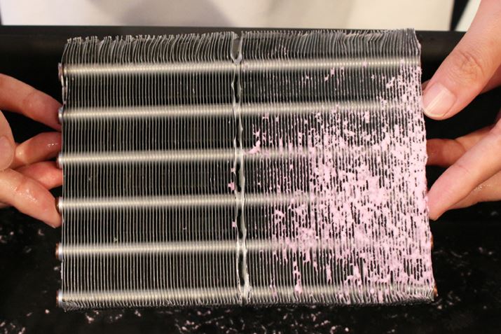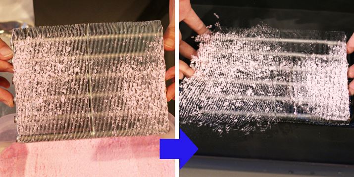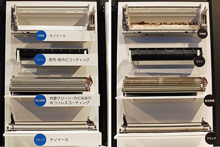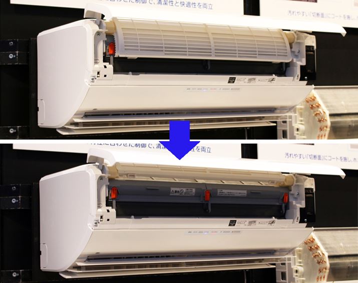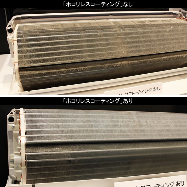 親水撥油コート剤の塗布や凹凸をなくした熱交換器の表面構造などの対策は「ホコリレスコーティング」と称されています。このホコリレスコーティングの有無によって、写真のように熱交換器の汚れは変わってくるそう
