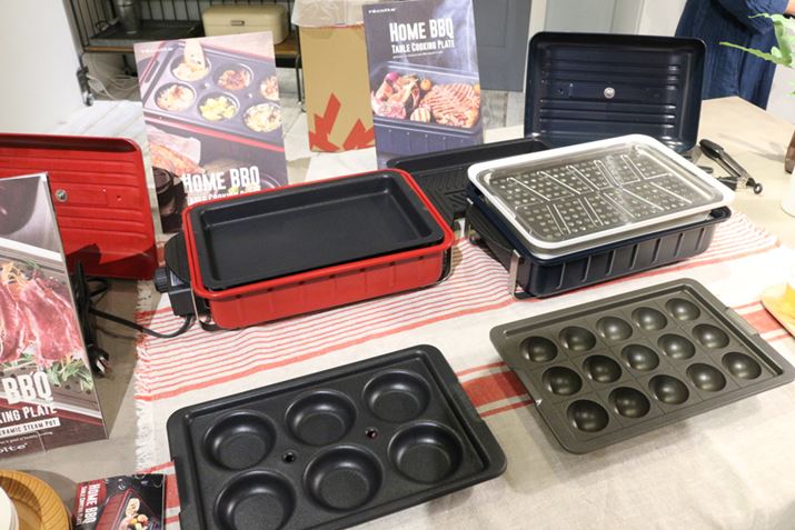 付属の「バーベキュープレート」「フラットプレート」のほか、丸い焼き型6個分を1度に焼ける「バラエティプレート(手前左、税別2,500円)」、煮込みや蒸し調理に使用できる「セラミックスチーム深鍋(右奥、税別3,000円)」「たこ焼きプレート(手前右、税別2,000円)」などの追加パーツが用意されています