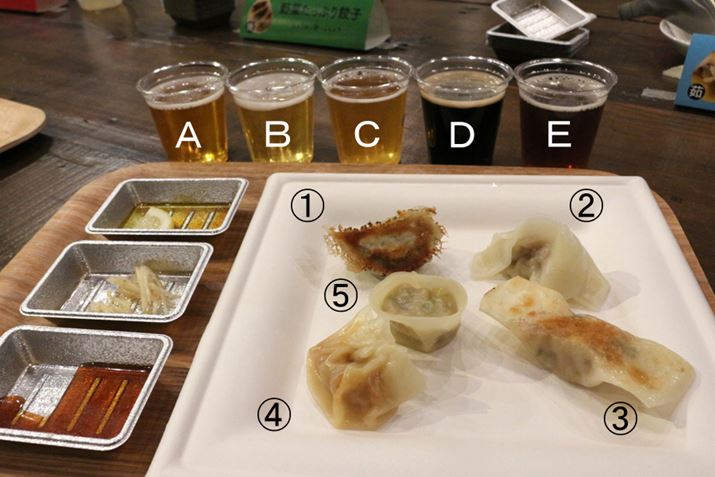 振舞われたのは、(1)野菜たっぷり餃子(2)レモン餃子(3)梅しそ餃子(4)ピリ辛えび餃子(5)セロリ&トマト餃子。組み合わせる「COEDOビール」は、(A)伽羅(B)瑠璃(C)白(D)漆黒(E)紅赤という5種です。