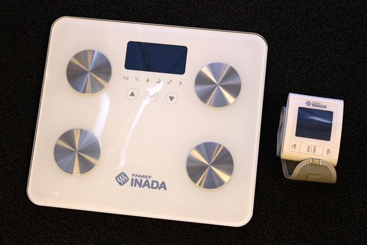 写真左から、ファミリーイナダ製の体組成計「FBS-100」(15,000円・税別)と、手首式血圧計「FBM-100」(15,000円・税別)です。いずれもBluetooth Low Energy(BLE)規格に対応しており、測定結果をワイヤレスでルピナスショルダーに共有できます