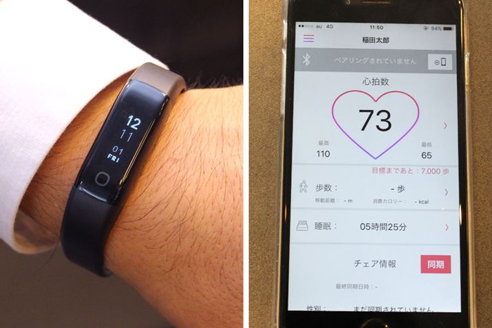 ファミリーイナダのウェアラブル端末「アクティブメジャー FMW-200」(10,000円・税別)は、脈拍や歩数、カロリー、歩いた距離、睡眠状態を測定できます。専用アプリ「ルピナスリンク365」(写真右)を使って、データを管理できます