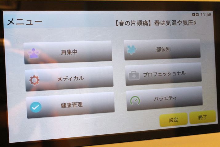 さっそくディスプレイから、マッサージモードを選択!「肩集中」や「メディカル」「プロフェッショナル」などのメニューを搭載しています
