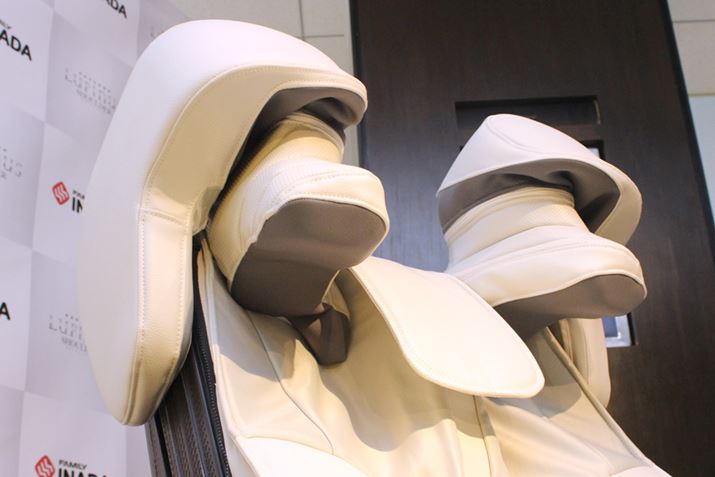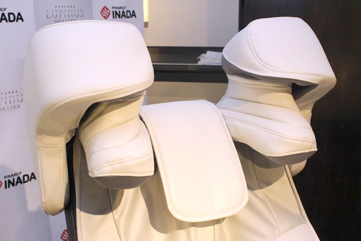 ルピナスショルダーは、その名が表す通り“肩もみ”の性能を高めていることが大きな進化点です。その特徴は、業界初という「左右独立型 人工知能 肩メカ」を搭載すること。ファミリーイナダの社内で“肩こり研究所”というプロジェクトを発足させ、大学や医療機関と連携しながら「どうしたら肩コリを解決できるか」と研究を重ねて開発されました。
