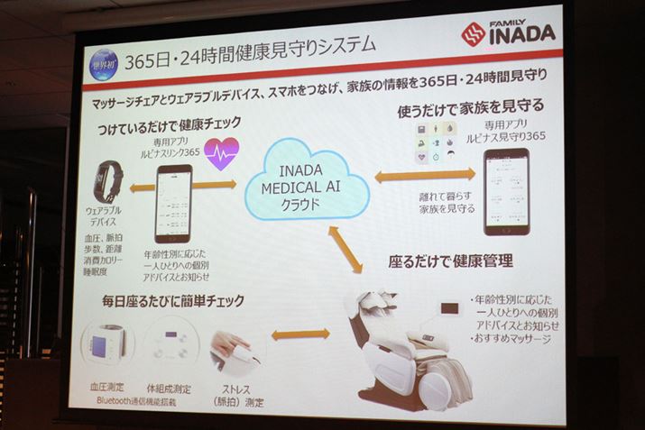 マッサージチェアとウェアラブル端末で、365日・24時間健康を管理するというシステムは世界初とのこと。ちなみに本機能はルピナスショルダーのユーザー登録情報と紐づくので、後述の各種デバイス単体での利用はできません