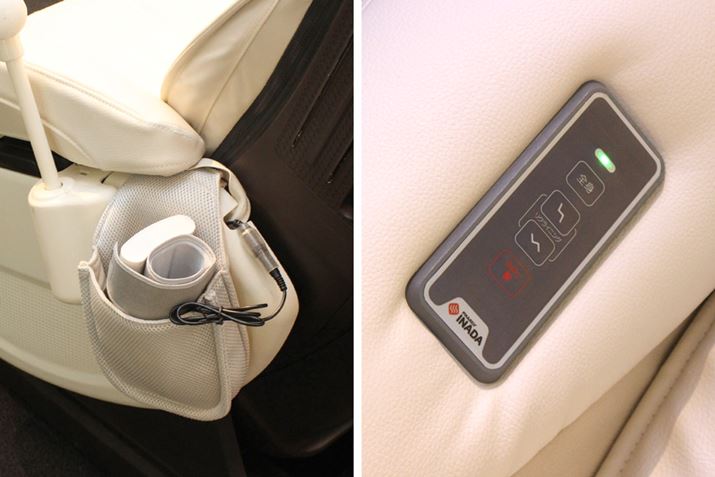 本体側面には、血圧計と脈拍計を入れておけるポケットを装備(左)。シートの内側には、リクライニング用のコントローラーを搭載します(右)