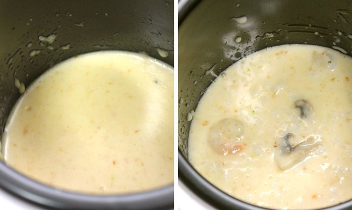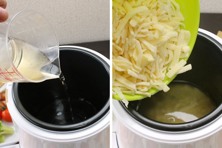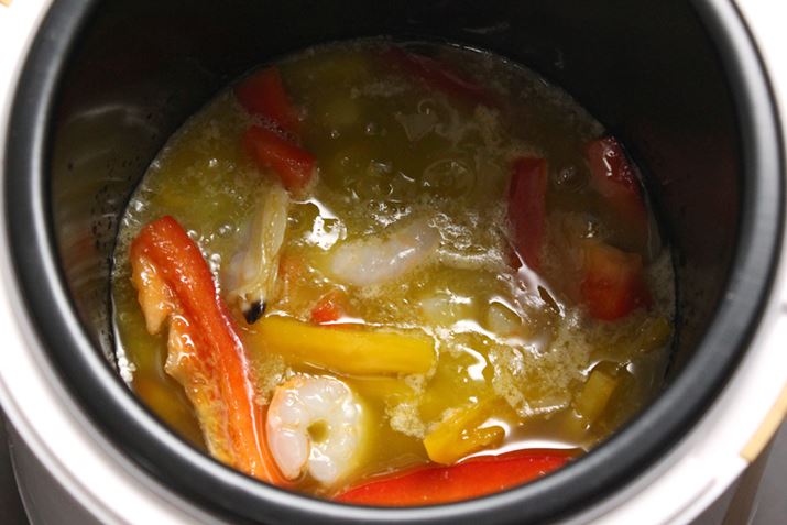 上述の通り、フロントに備えるダイヤルで温度調整がカンタンにできることは本製品のポイント。この特徴を生かして、たとえばアヒージョのように、食材を低温で調理することもできます。オリーブオイルとニンニクを内鍋に入れて熱したら、あとは野菜や魚介などの具材を入れて80℃に設定して煮込めば、「魚介のアヒージョ」ができちゃいました。