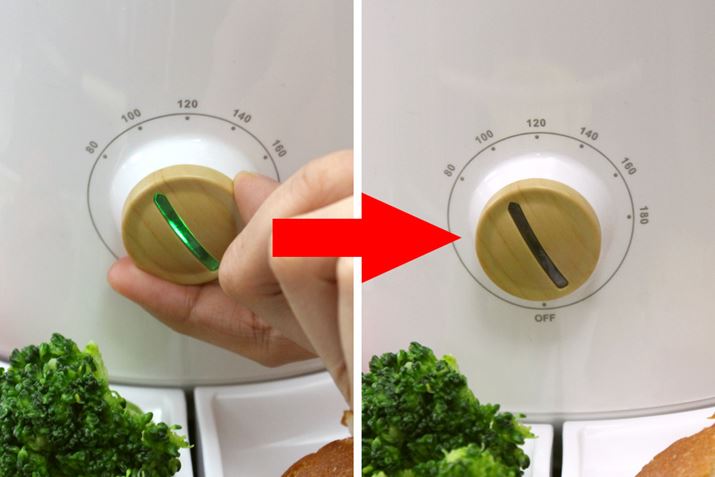 加熱中はダイヤルのランプが緑色に点灯し、設定温度になるとランプが消灯する仕組み(ちなみに安全装置の温度フューズは216℃、消費電力は800Wです)。このダイヤルは無段階調性タイプなので、80℃と100℃の目盛りの間の90℃くらいに設定するといったこともできます