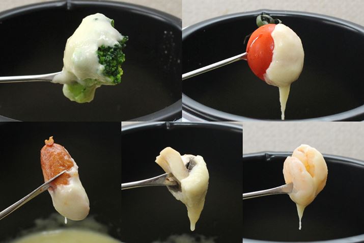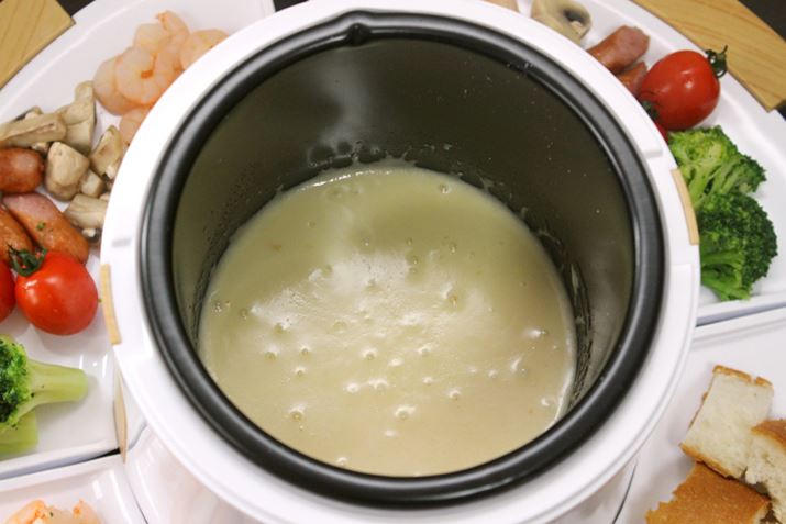 チーズの香りが部屋に充満してきました。チーズソースができたら、温度を最弱80℃にしてキープしましょう。それではいざ、ひとりチーズフォンデュ開始!