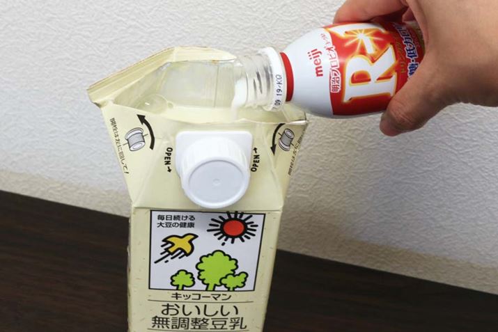 今回は無調整豆乳を使って、豆乳ヨーグルトを作ります。口を開けて種菌となるヨーグルトを入れてよく混ぜます