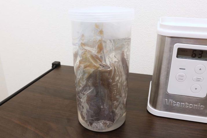肉の入った袋を熱湯に浸し、それを本体にセットして、62℃で3時間加熱するだけ